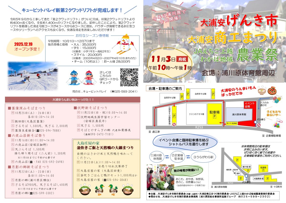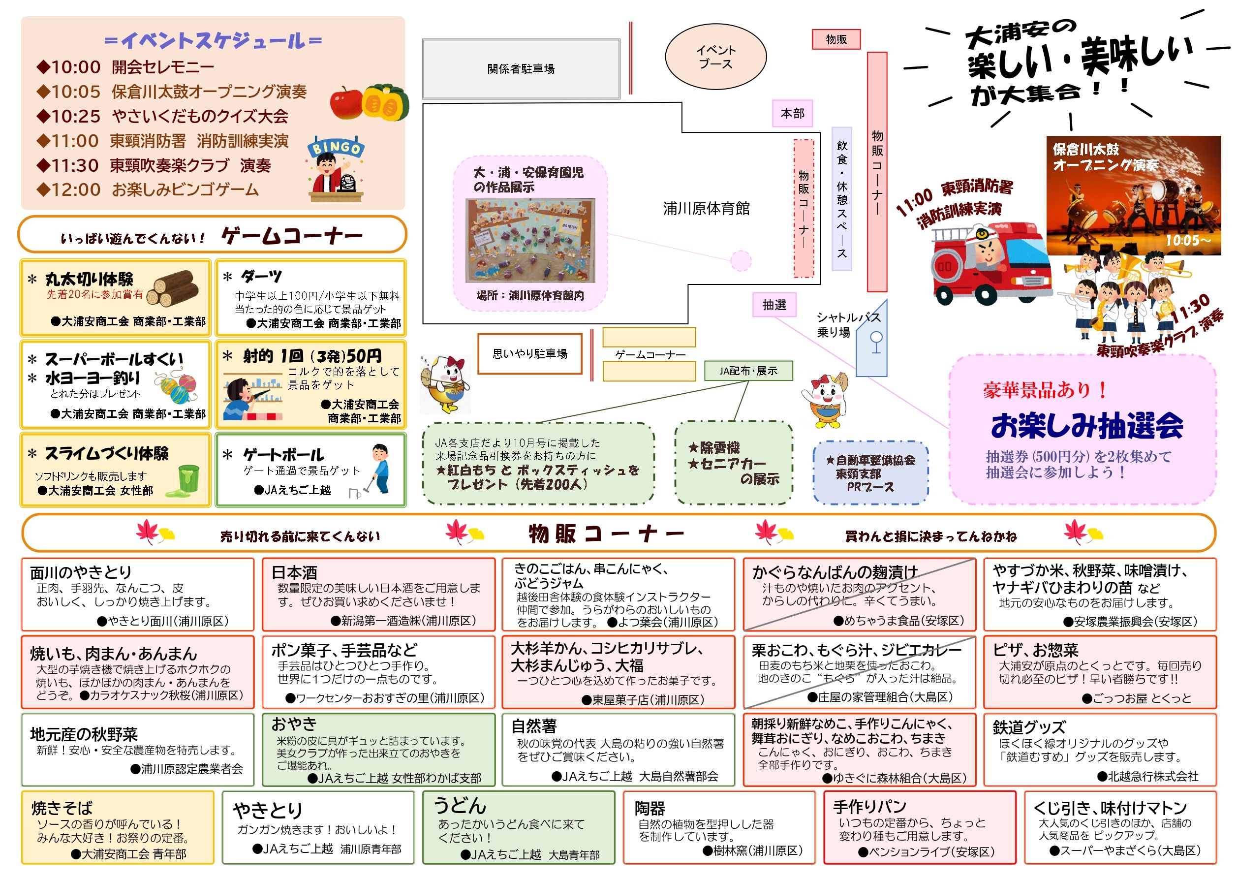 大島区・浦川原区・安塚区の店舗・事業所等と大浦安商工会、JAえちご上越わかば地域の協力団体や北越急行株式会社など19団体が、農産物や特産品、飲食品を販売するほか、会場で楽しんでいただけるビンゴゲームや抽選会などを行います。