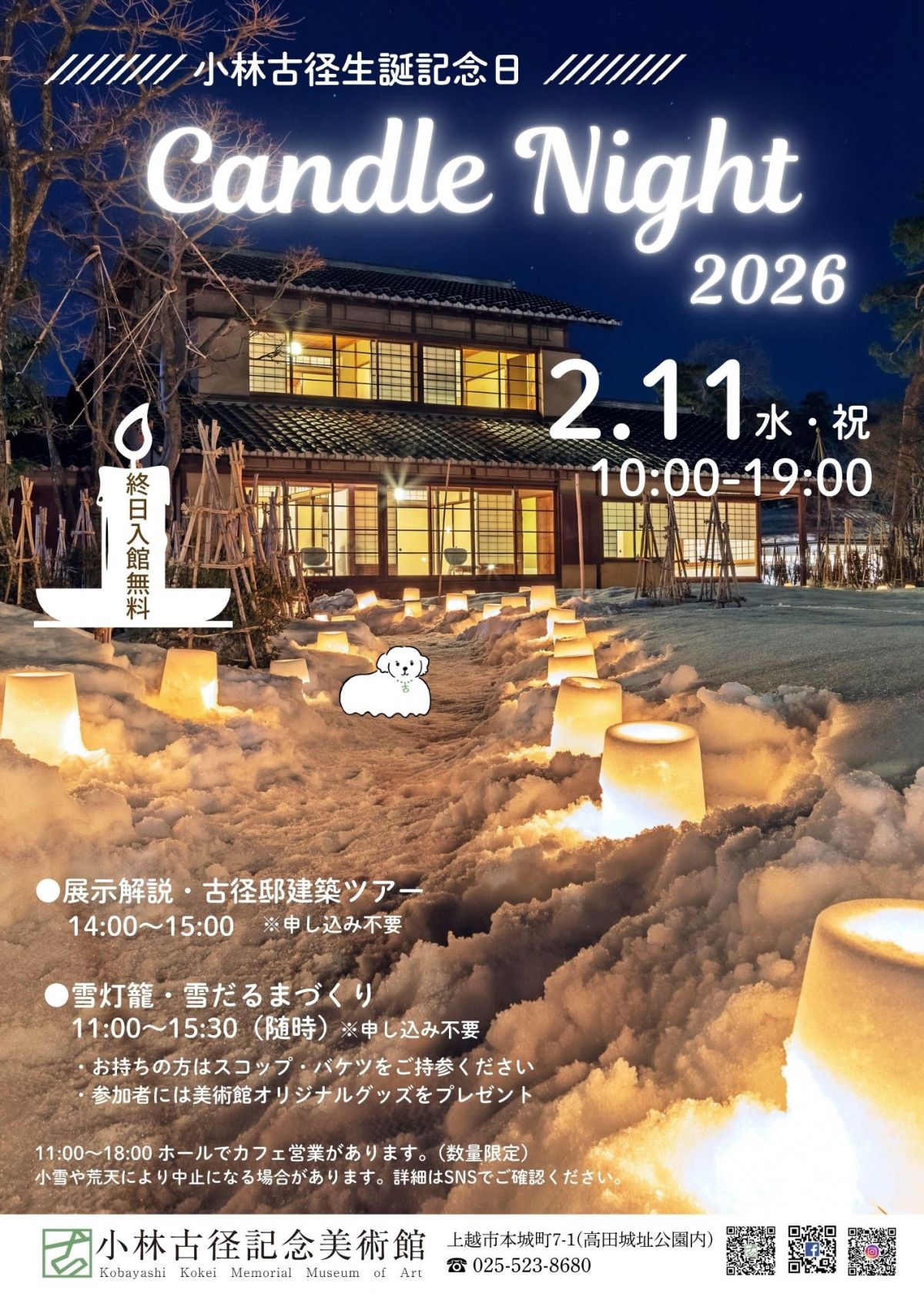 小林古径の生誕日を記念して、庭園に作った雪灯籠にあかりをともし、冬の美術館を彩ります。当日は終日、入館無料です。
