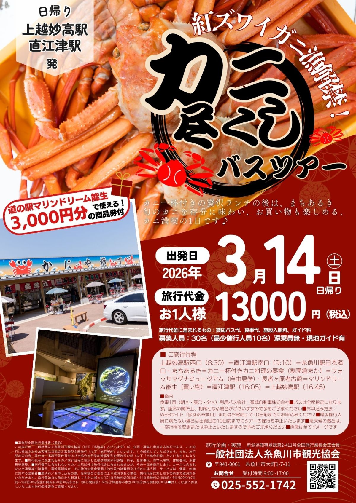 行程:上越妙高駅西口(8:30)=直江津駅南口(9:10)=糸魚川駅日本海口・まちあるき=カニ一杯付きカニ料理の昼食(割烹倉また)=フォッサマグナミュージアム(自由見学)・長者ヶ原考古館=マリンドリーム能生(買い物)=直江津駅(16:05)=上越妙高駅(16:45)
