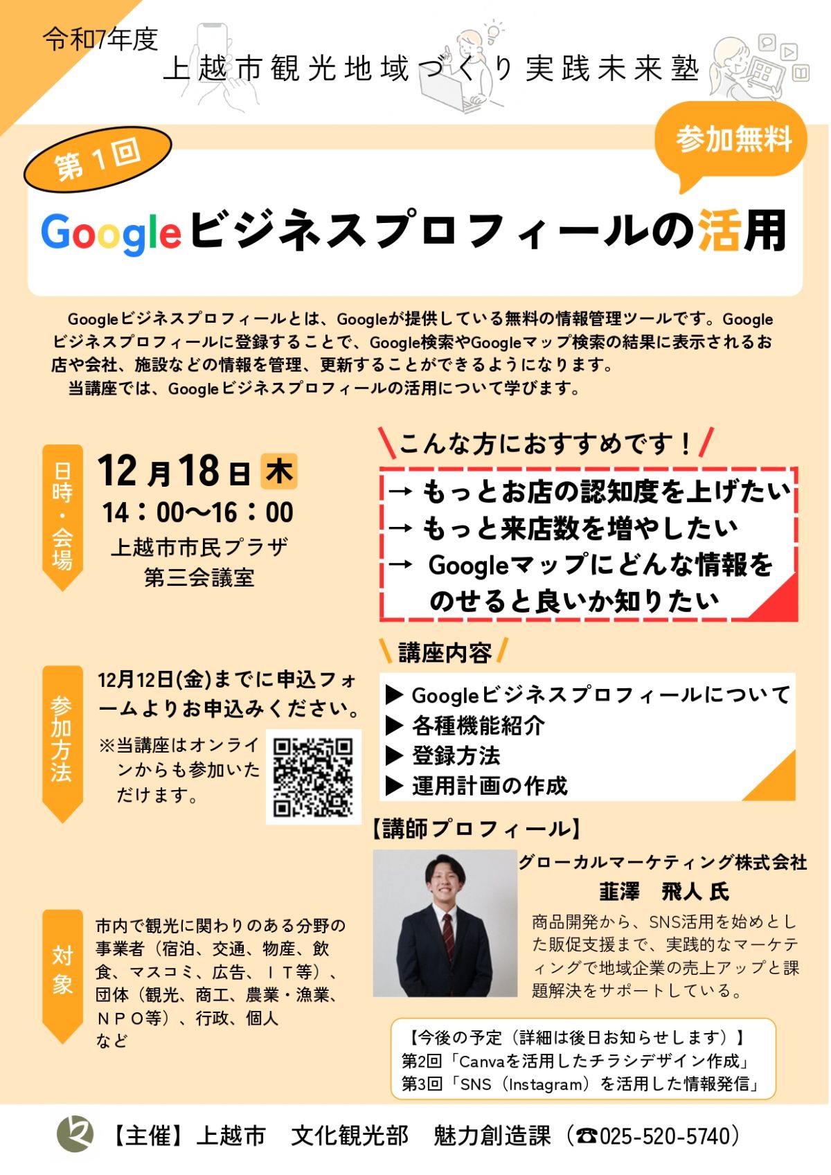 「Googleビジネスプロフィールの活用」を学ぶ講座(上越市観光地域づくり実践未来塾)のご案内