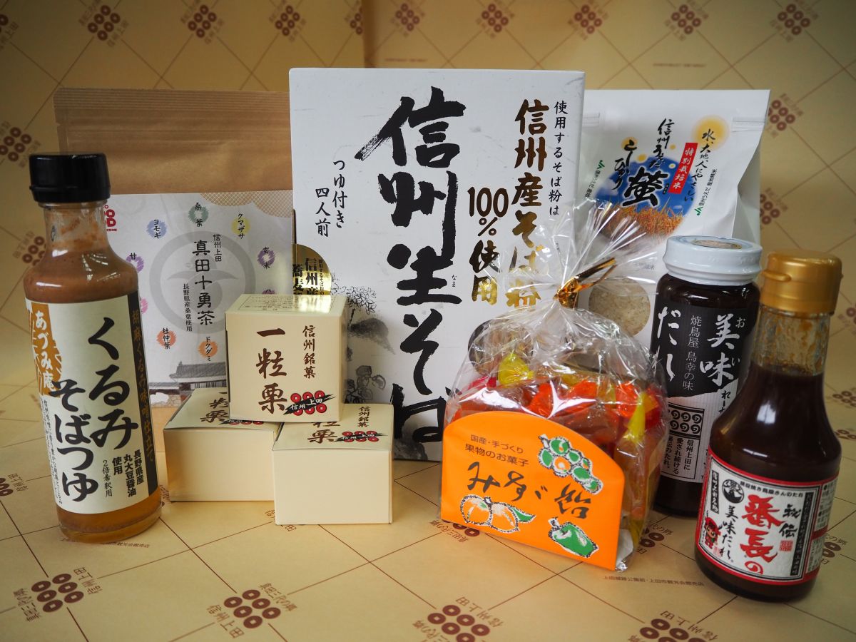 - (一社)信州上田観光協会・・・くるみ生そば、りんごジュース、みすず飴 他